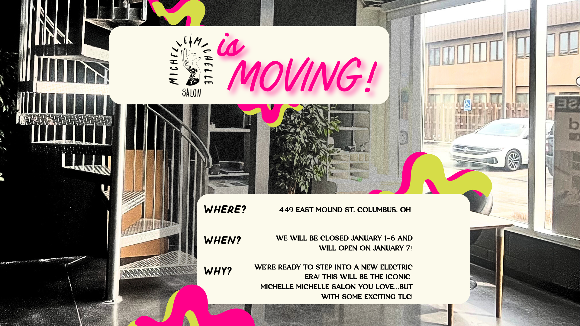 Michelle Michelle Salon will remain open at our 700 Bryden location through the end of the year! We will be closed from January 1st to January 6th and will reopen on January 7th in our new home at 449 E. Mound St.