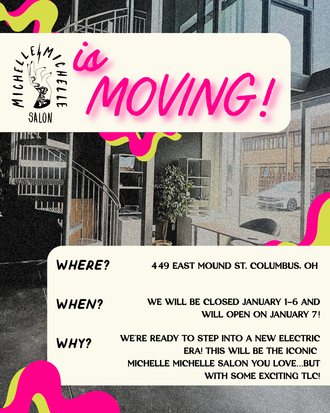 We're thrilled to share that Michelle Michelle Salon has found a new home! You can still find us at our 700 Bryden Rd. location through the end of the year...Then, we will close from 1/1-1/6, and open our doors again on 1/7 in our new space at 449 E. Mound St. in Columbus, OH.